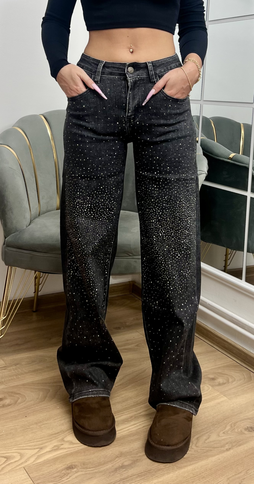 Blugi Evazați elastici cu aplicații din strasuri
